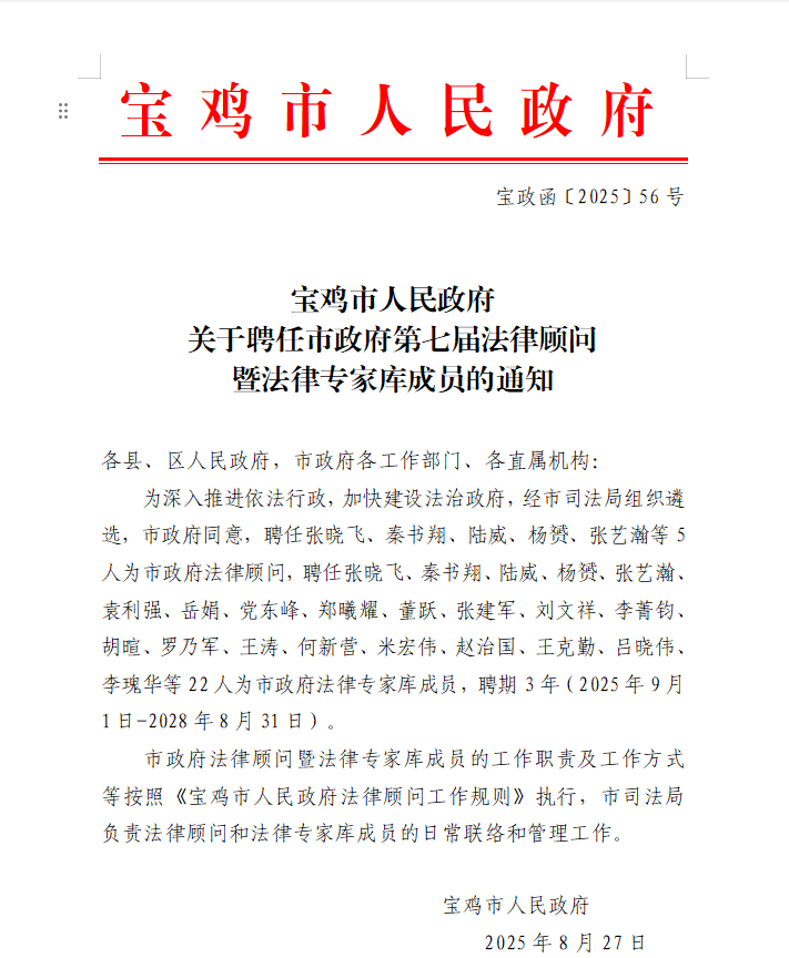 寶雞市人民政府關于聘任市政府第七屆法律顧問暨法律專家庫成員的通知